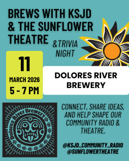 Members of the KSJD and Sunflower Theatre staff and DJ corps will be at Dolores River Brewery on Wednesday, March 11th from 5 to 7pm to answer your questions about community radio and performing arts with our organization.