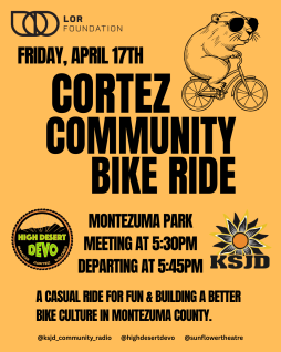 High Desert Devo in association with KSJD invite all to participate in this family friendly community bike ride around Cortez. This ride sticks to bike lanes and park paths and aims to provide a space for community members to connect, move their bodies, and build a positive bike culture in Cortez.