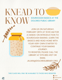 On Saturday February 28th from 10:00am until noon, Dolores Public Library will host a hands-on introduction to sourdough.