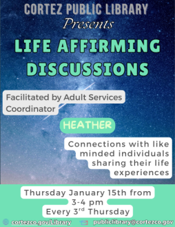 Cortez Public Library will host a session on every third Thursday at 3:00pm entitled "Life Affirming Discussions". This will enable attendees to explore positivity and self-care through affirmations, mindful eating, healthy tips, and related topics.