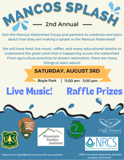 The Mancos Watershed group and partners will hold a Mancos Splash event on Saturday, August 3rd from 11am to 3pm at Boyle Park in Mancos. Attendees can learn more about the work happening across the watershed, and enjoy vendors, and live music.